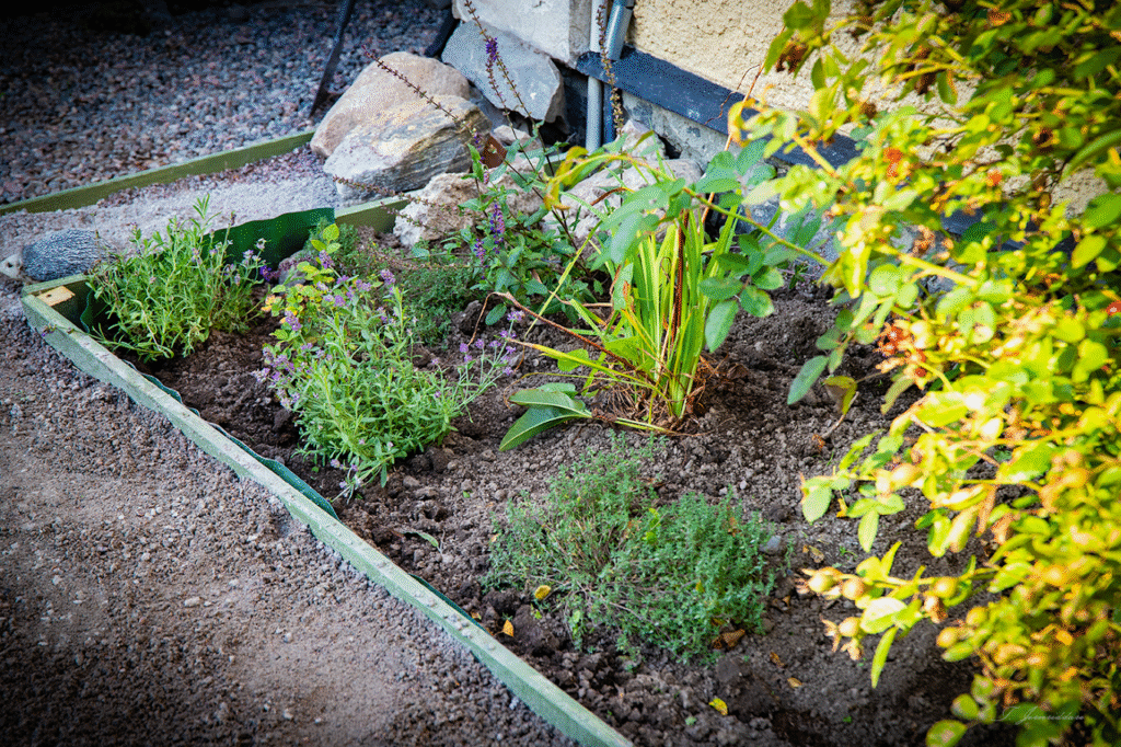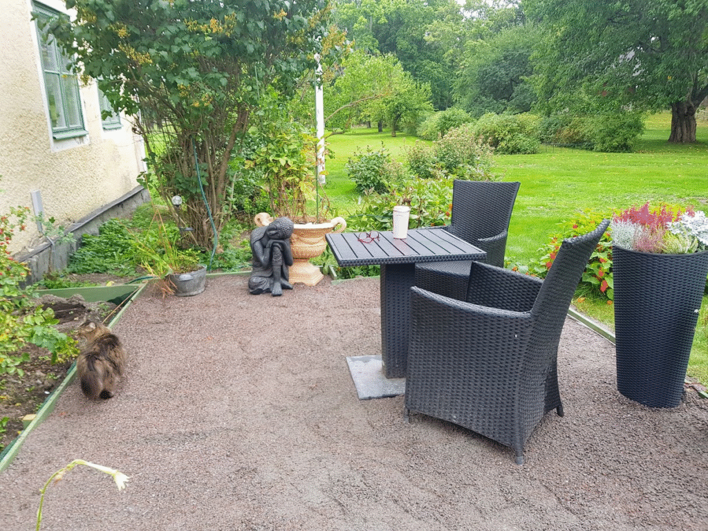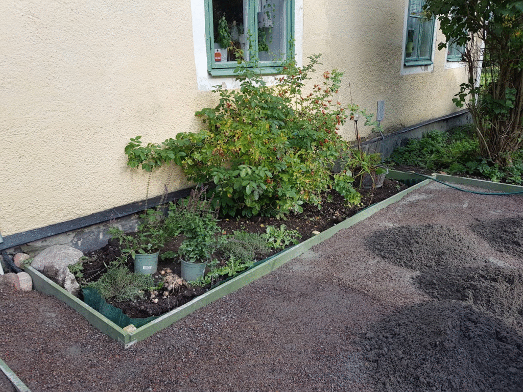 Och sen blev det en uteplats också, och det tog en jäkla tid att få till. Marken var ett kaos av uppgrävning, sten, rötter mm. Jag fick meja ner allt, fylla i alla hål, lägga markduk, bygga en ram och sen börja skyffla på stenmjöl/sättsand. Dessutom hade jag en vild fajt med två stora nyponrosor och en invasion av kirskål och brännässlor. Till slut blev det något liknande en uteplats och jag hann peta ner några perenner. (Bilder: work in progress).