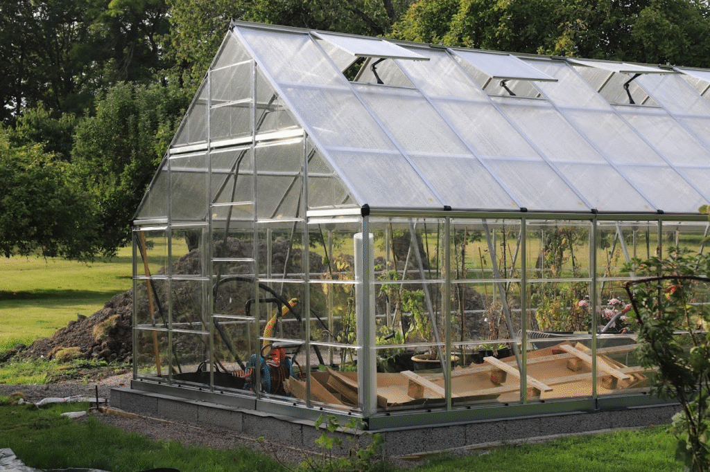 Så det blev ett växthus…. 30 kvm och med 9 takfönster. Takfönster som jag inte hade råd att utrusta med ”temperatur-automatik” utan jag får öppna dem manuellt. Någonstans måste jag dra gränsen för utgifterna.