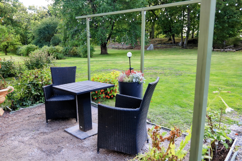 Jag har fortfarande inte bestämt hur uteplatsen ska se ut, särskilt när det kommer till spaljén. Det finns ganska många skisser på mitt ritbord, men det får vänta. Grunden är lagd och det får räcka för stunden.